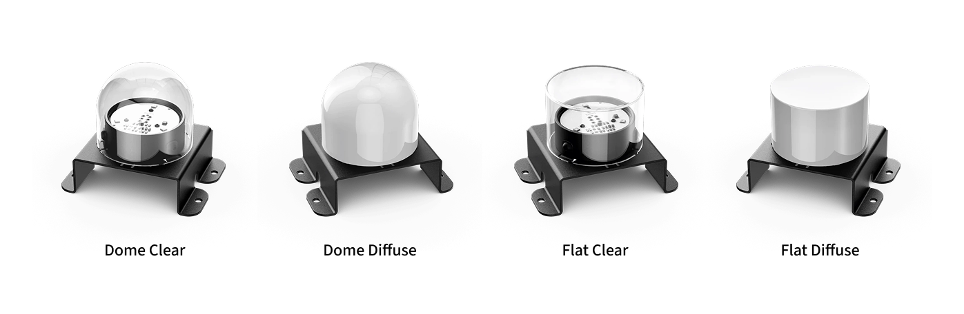 Four interchangeable diffuser options—Dome Clear, Dome Diffuse, Flat Clear, and Flat Diffuse—allow you to tailor light output and visual effects to suit your specific application.
