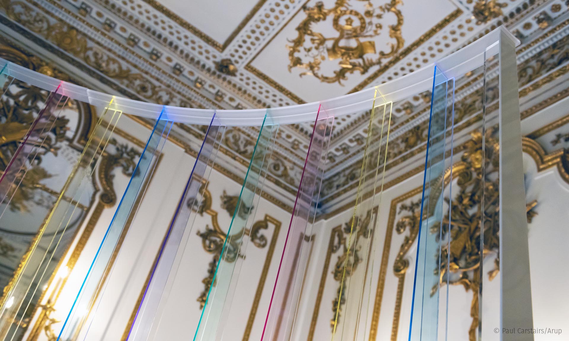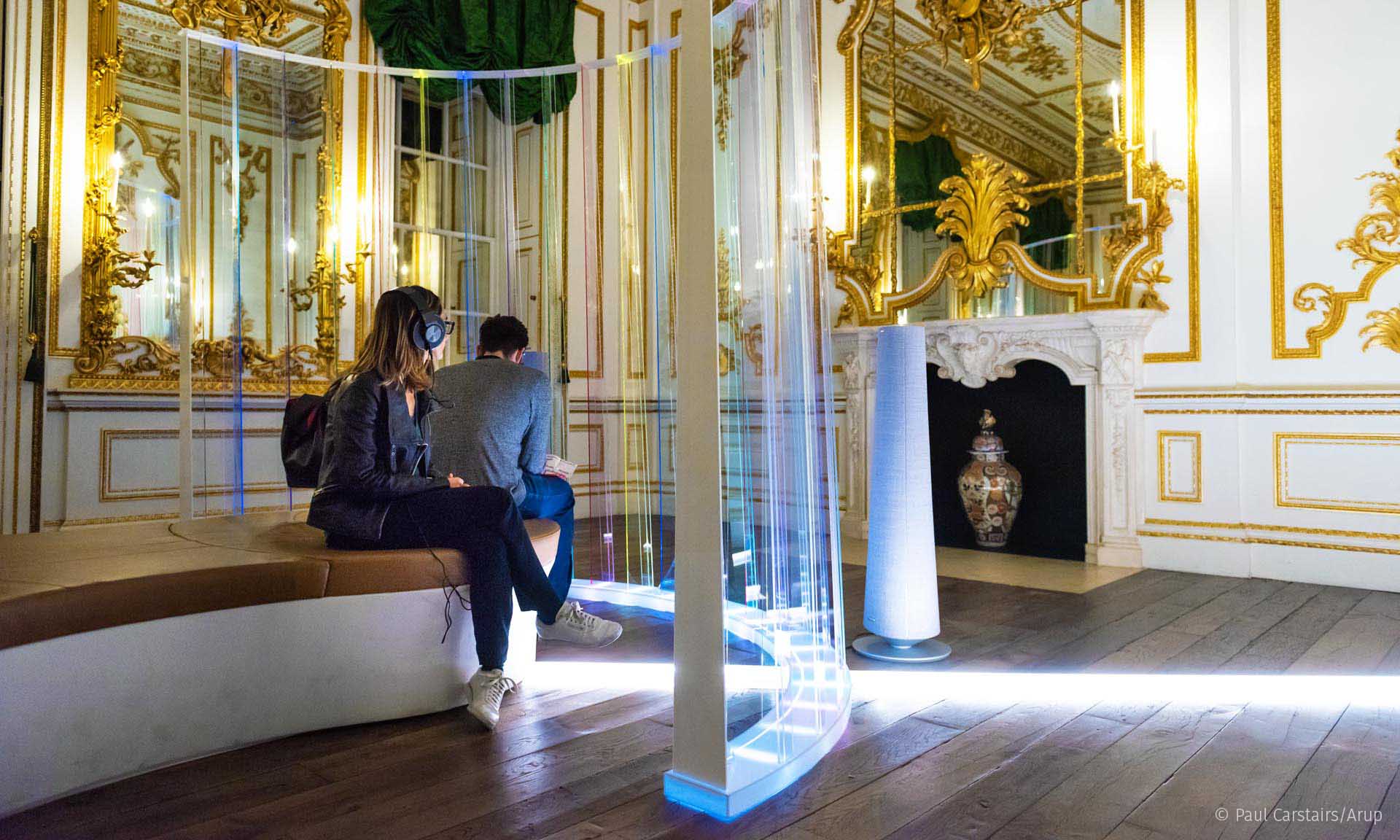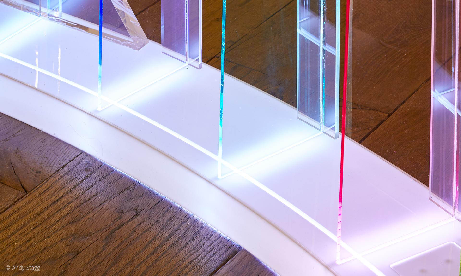 The location for the project was the stunning 18th century Norfolk House Music Room in the V&A Museum, London. The project featured a viewing and listening bench, with a transparent screen curved around one end. The screen was designed to envelop the visitor in Pärt’s music and featured vertical slats of Perspex® acrylic (from the Vario collection) which were lit up by 5 colours specifically chosen by Arup to represent the full colour spectrum.