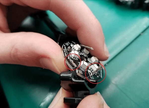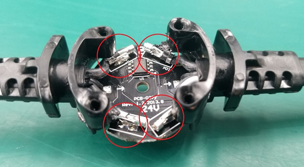 What we can see here is that the wires simply soldered onto the PCB pads, and the whole assembly then encapsulated. If you’ve done much soldering at all you’ll know that even a good cable-pad solder joint is still relatively weak. Tension may not break the solder joint immediately but can easily pull the pad clean off the board. This is stabilised by the resin somewhat but is still a weaker joint that could more easily give way over time after temperature and load cycles.