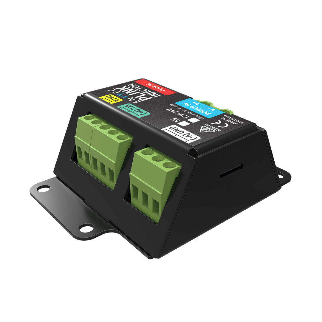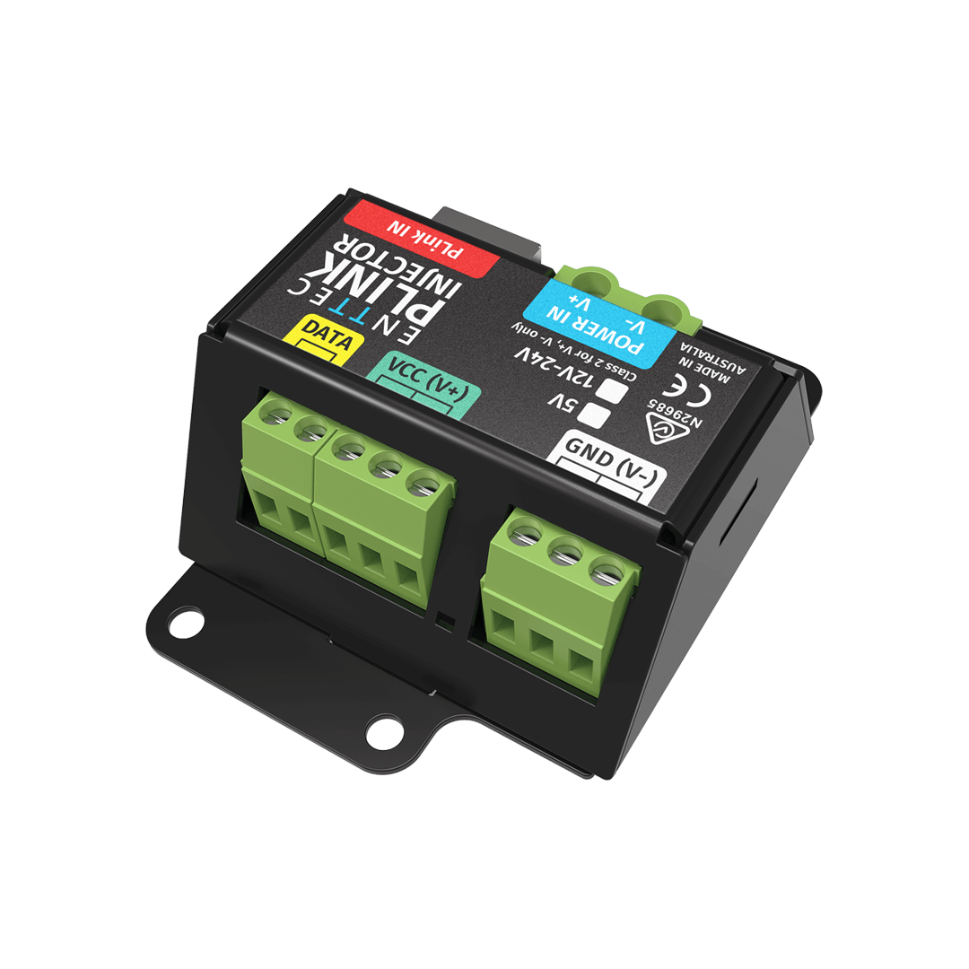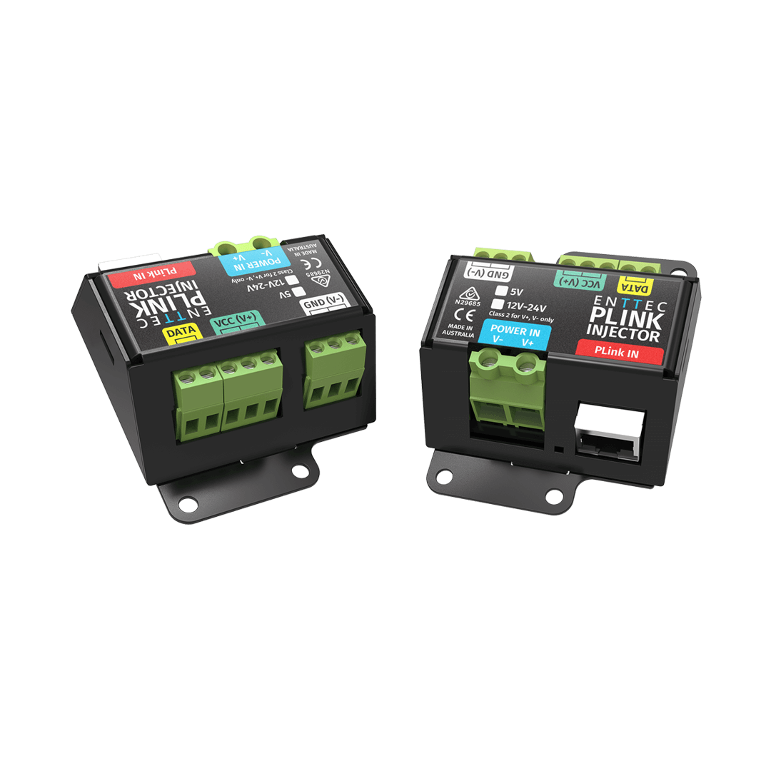 The PLink Injector has been engineered to work as part of an ENTTEC Pixelator Series set up to make it fast, easy and affordable for you to control LED pixel strips or pixel dots over long distances. The injector features an external DC power supply as well as high-power screw terminal connectors.