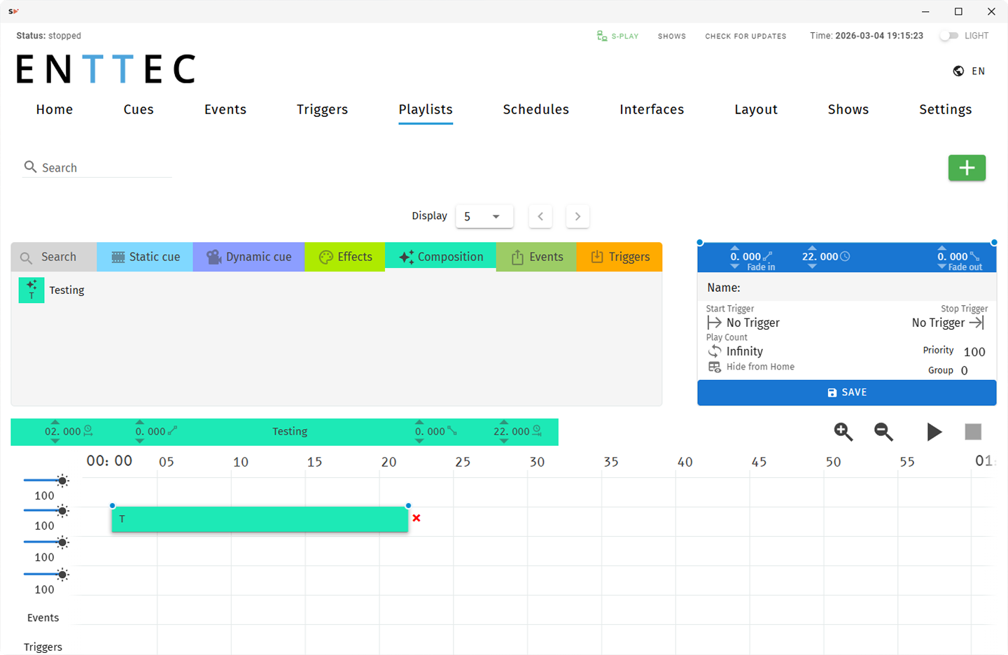 If you already use the S-Play smart light show controller, you already know this software. S-Play Programmer is the desktop version of the same interface: the same cue types, the same playlist builder, the same scheduling and trigger options, plus one addition. Composition Cues is a shader-based animation type exclusive to the desktop software, not available in the browser interface.