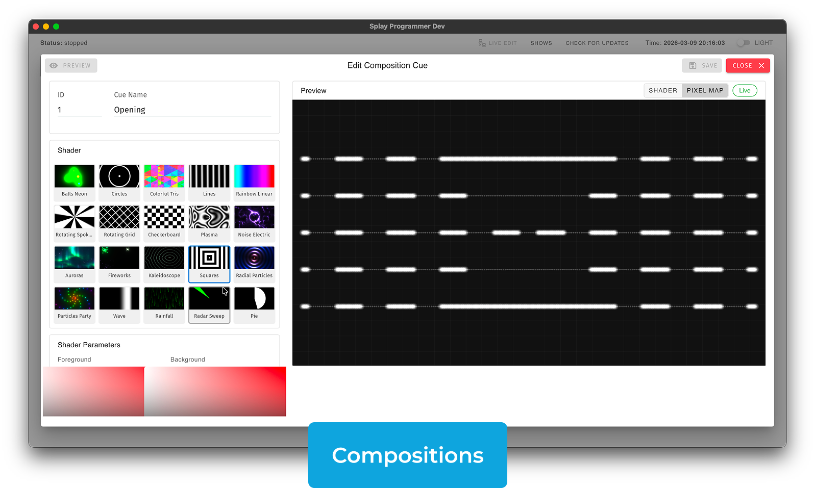 - Select a shader preset and adjust colour/speed/intensity
