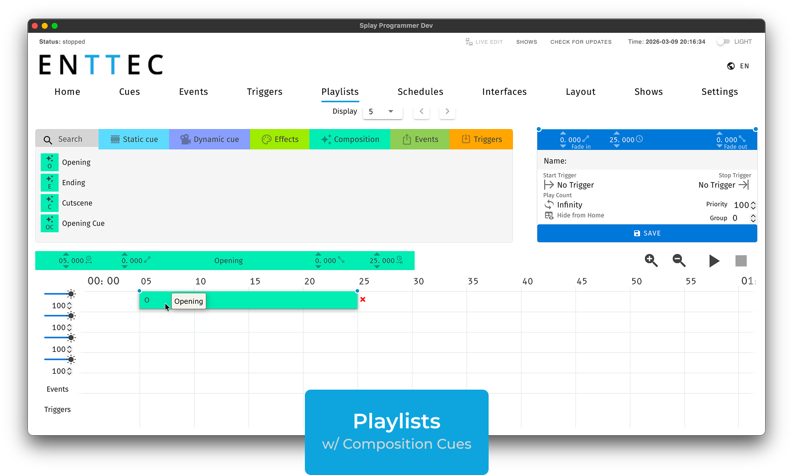 If you already use the S-PLAY smart light show controller, you already know this software. S-PLAY Programmer is the desktop version of the same interface: the same cue types, the same playlist builder, the same scheduling and trigger options, plus one addition. Composition Cues is a shader-based animation type exclusive to the desktop software, not available in the browser interface.